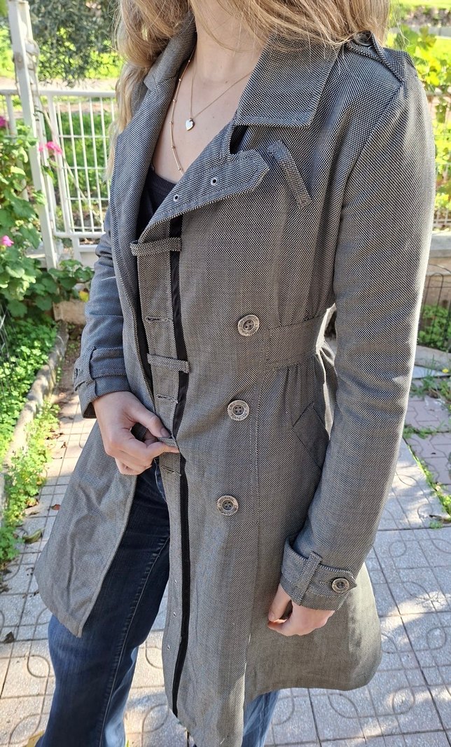 Kadın gri midi trençkot, düğmeli ve notched yaka detaylıdır. Uzun kollu, regular fit ve günlük sokak stili için uygundur.
