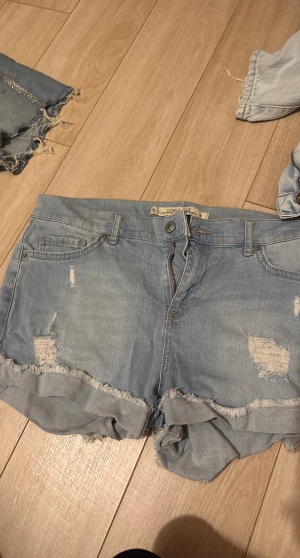 Yıpranmış detaylara sahip bol kesim gri mini denim şort, tokalı bel kısmıyla rahat ve şık. Günlük sokak stili için ideal.