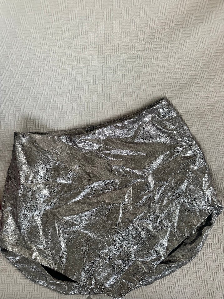 Kadınlar için gri renkli, pilili detaylara sahip, keten kumaştan yapılmış mini kısa şort. Dış mekan kullanımı için avant-garde, modaya uygun tarzda.