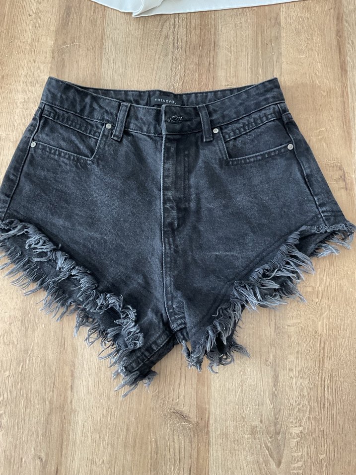 Kadınlar için tasarlanmış bu gri mini kot şort, bol kesimi ve püsküllü kenarlarıyla rahat ve şık bir sokak stili sunar.