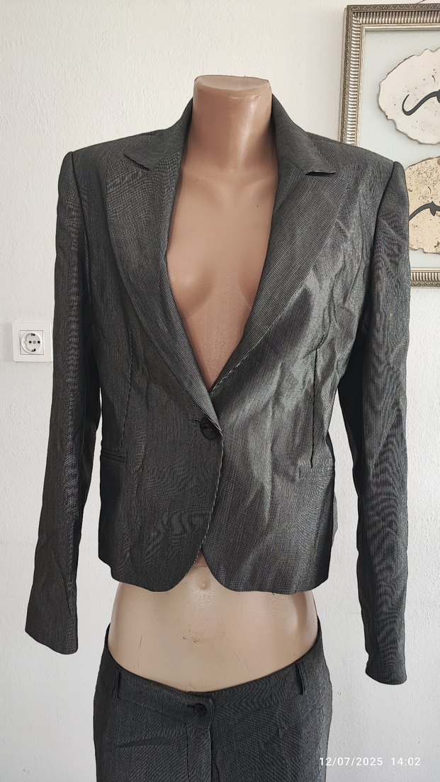 Kadın gri mini saten blazer ceket, keskin yaka, uzun kollu ve düğmeli ön tasarıma sahiptir. Ofis için uygun, regular fit ve kısa boyda. Puane marka çok az giyilmiş tertemiz bir üründür. Pantolon boy 95 cm bel 40 cmdir. ceket omuzdan boy 57 cm iki kol arası 34 cm bel 40 cm kol uzunluğu 55 cmdir. etiketinde 42 beden yazsa da dar kalıp bir üründür 40 beden uyumludur.
