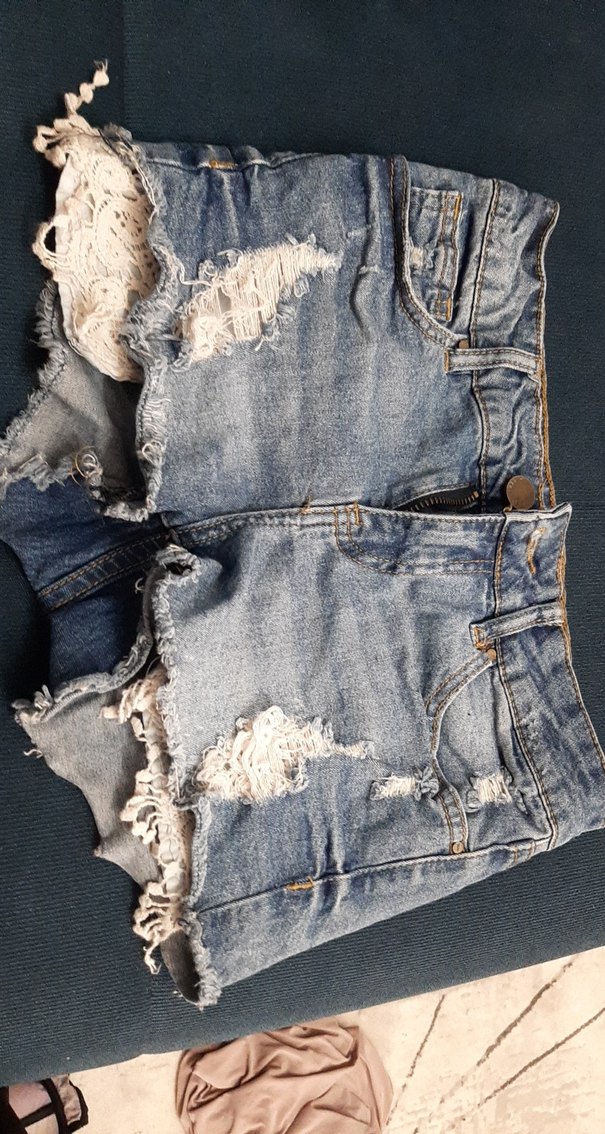 Kadınlar için düğmeli, bol kesim gri mini denim şort. Yırtık detayları ve dantel astarı ile gündelik sokak stili için uygundur.
