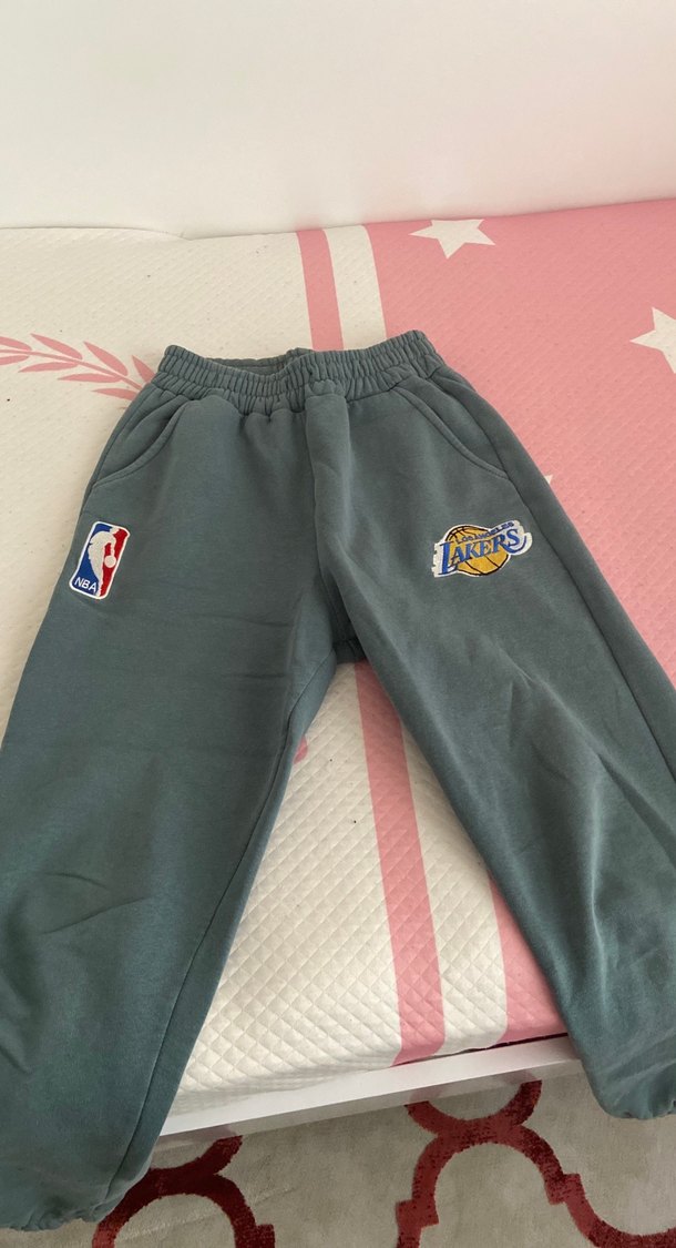 Gri, rahat kesim, nakışlı NBA ve Lakers logolu kadın eşofman altı, düğmeli detaylı ve elastik bel bantlıdır. Spor ve günlük kullanıma uygundur.