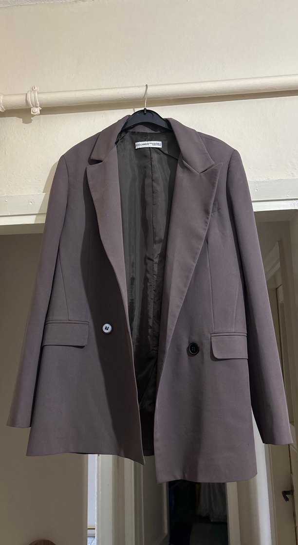 Gri renkte, notched lapel yaka ve düğmeli kadın blazer. Normal boy ve uzun kollu, sentetik kumaştan, ofis için uygun şık tasarım.