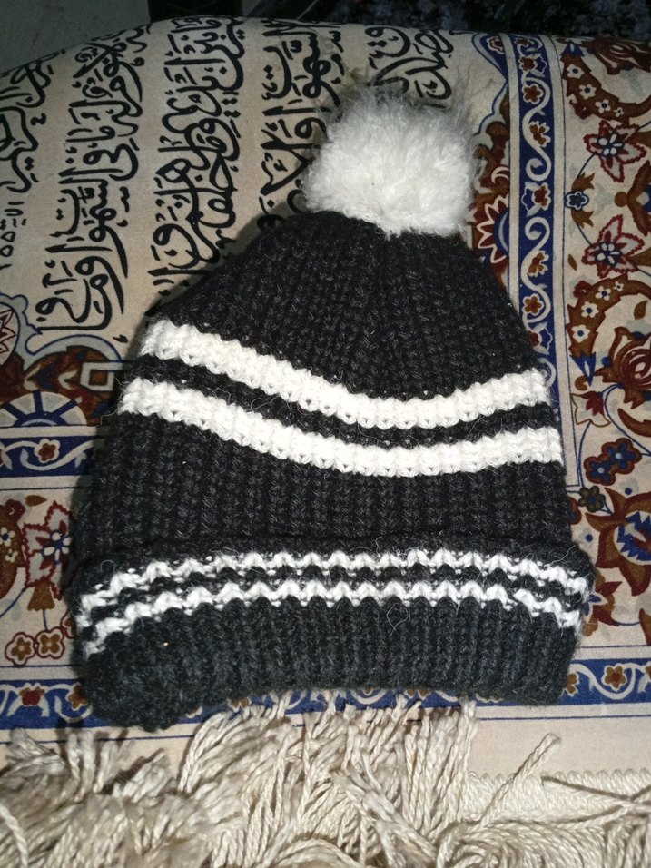 Kadınlar için gri renkli, beyaz çizgili ve üstünde yumuşak beyaz ponpon bulunan örgü bere. Sıcak ve rahat bir dokunuş sağlar.