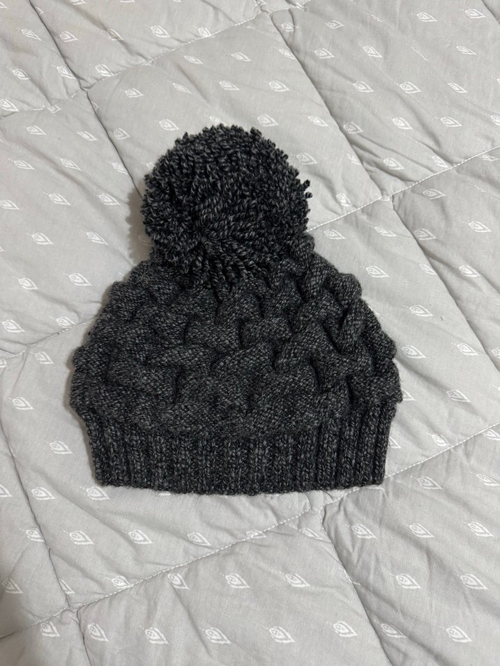 Kadınlar için örgüden yapılmış, üstünde ponpon bulunan gri bere. Yumuşak örgü kumaştan, rahat ve sokak stili uyumlu.