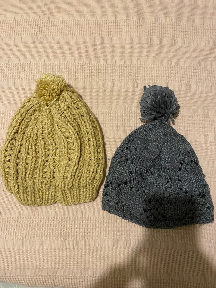 Gri renkli, ponponlu kadın bere. Yumuşak örgü kumaştan, rahat ve bohem tarzda örülmüştür. Soldaki sütlü kahve el örgüsü