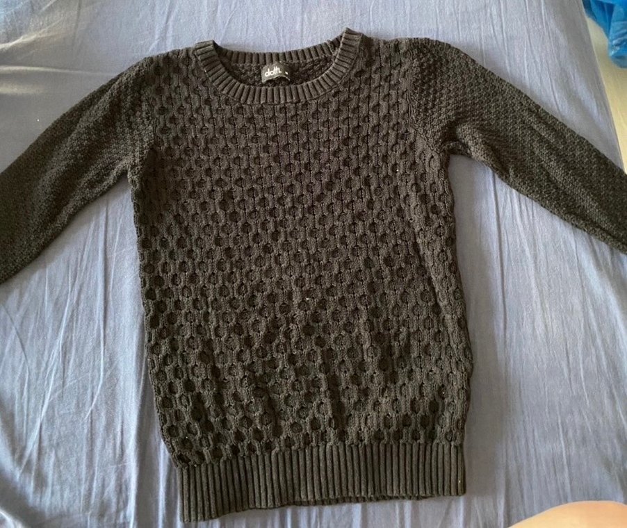 Kadın örgü kazak, yuvarlak yaka ve uzun kollu. Gevşek kesim, midi boy ve gri renkte, rahat ve gündelik kullanıma uygun.