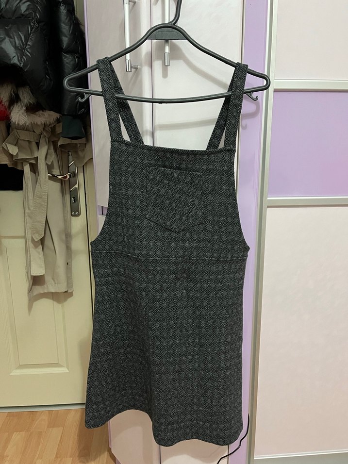Gri örgü kumaştan yapılmış, askılı, yüksek yakalı, midi boy ve vücuda oturan kadın kısa tulum.