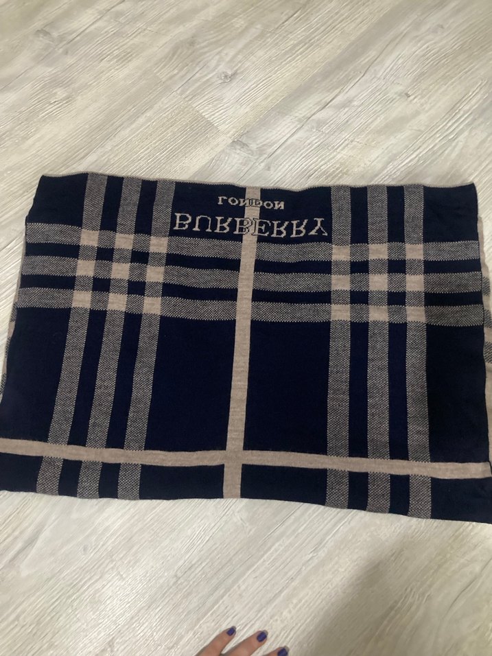 Kadınlar için örgü dokulu, koyu gri renkte, Burberry logosu işlenmiş, rahat ve şık street wear tarzı atkı. Yumuşak sentetik kumaştan üretilmiştir.
