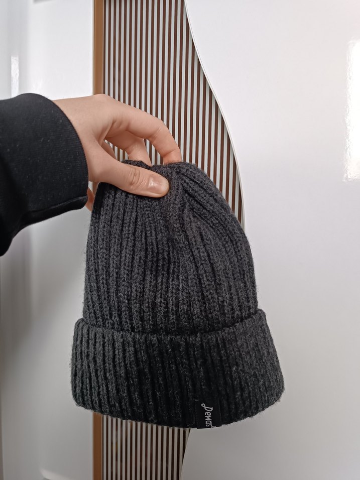 Gri örgü yünden yapılmış bu kadın bere, rahat bir uyum ve sokak modası tarzı sunar.