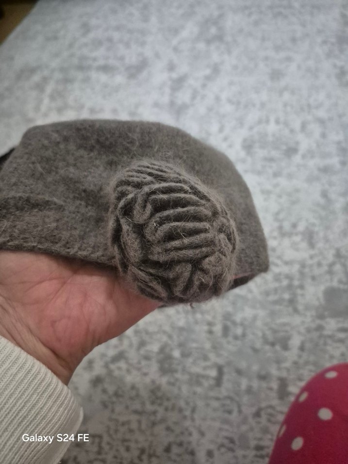 Yumuşak yünden örülmüş, gri renkte, örgü çiçek detaylı kadın bere. #bere