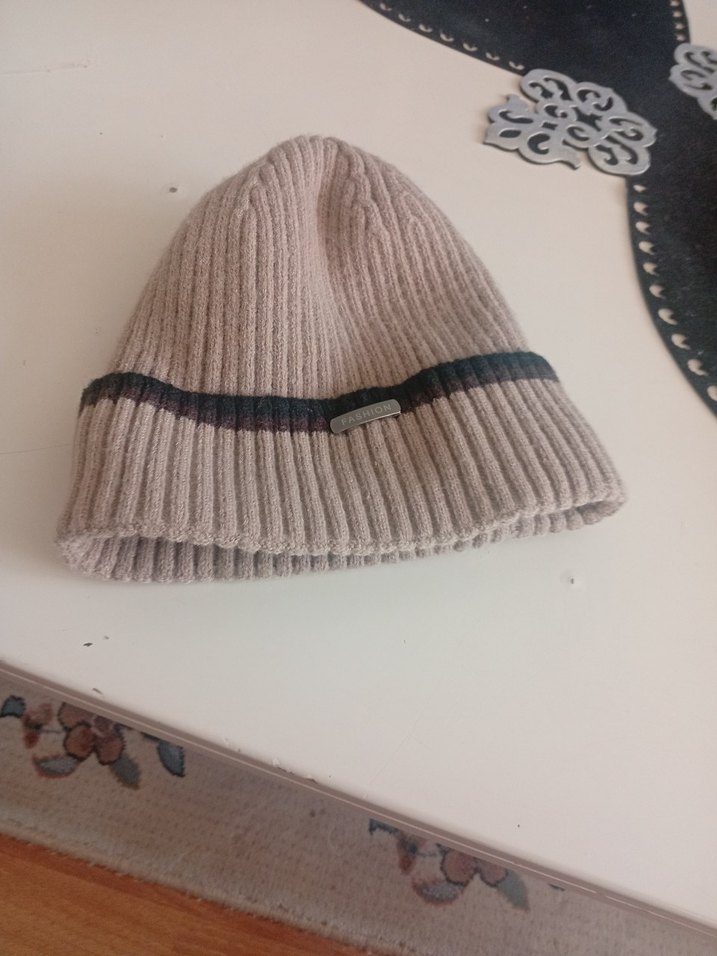 Kadınlar için gri renkte, siyah şerit detaylı örgü yün bere, rahat ve trend sokak stilini yansıtır.