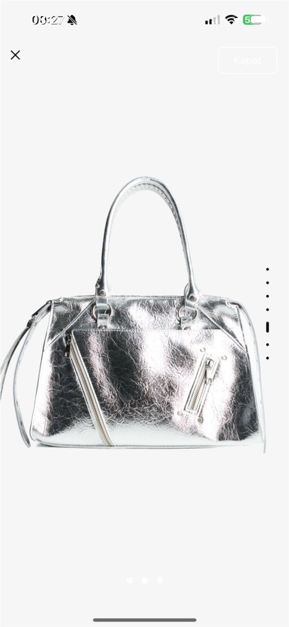 Parlak gri deri, fermuarlı detaylar ve çağdaş tasarımıyla sokak stiline uygun kadın çantası.