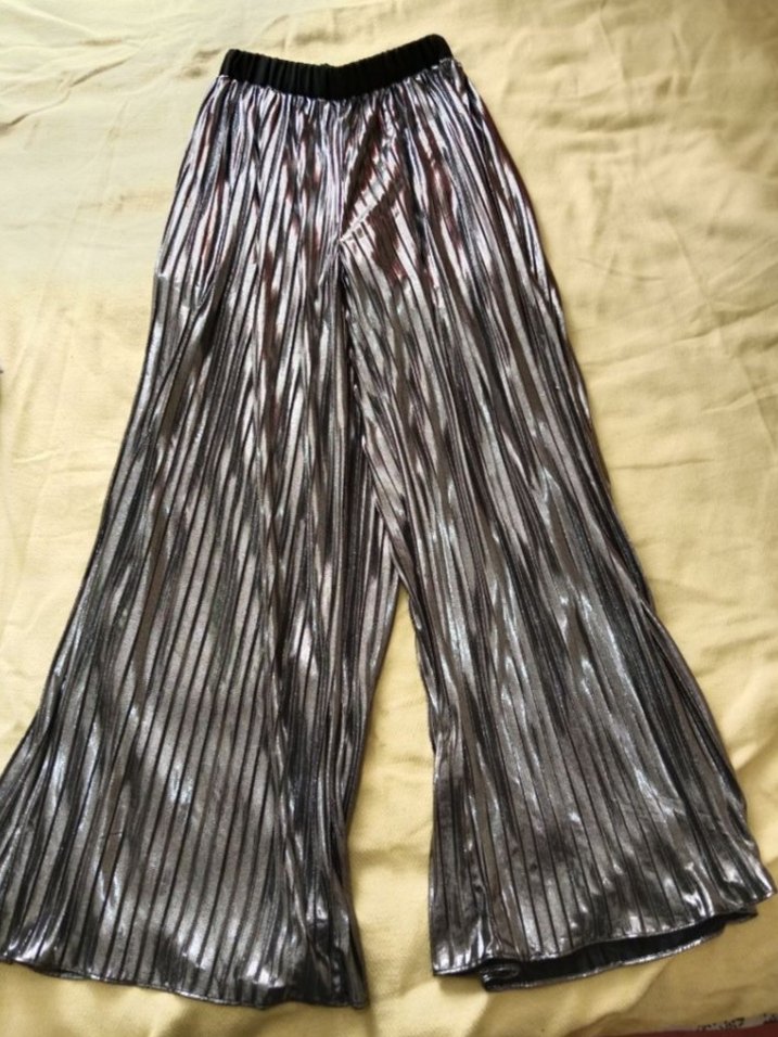 Kadınlar için uzun, salaş kesim, parlak gri sentetik kumaştan pilili pantolon. Parti ve avangard sokak modasına uygun. ✨
