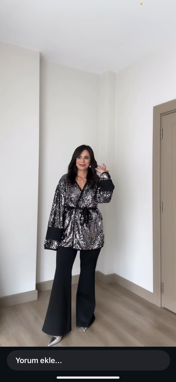 Kadın Gri Parlak Yılan Desenli Midi Kimono