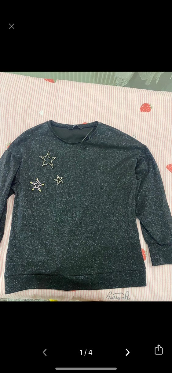 Kadın sweatshirt, uzun kollu ve yuvarlak yakalıdır. Sentetik kumaştan, koyu gri renkte, payetli yıldız desenleriyle sokak tarzına uygundur.