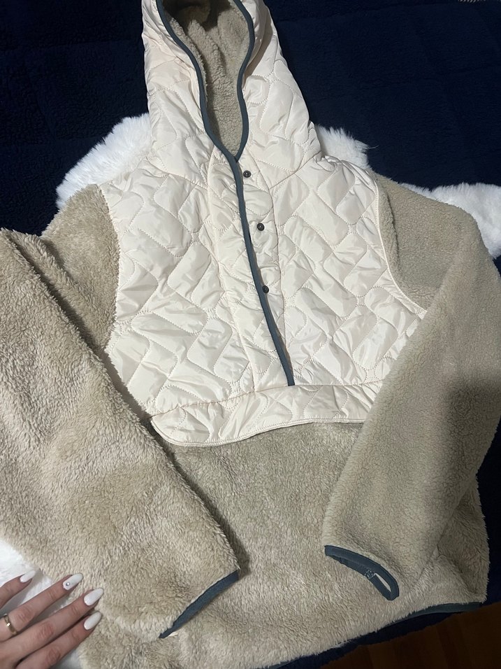 Kadınlar için yüksek yakalı ve uzun kollu, peluş dokulu, beyaz ve gri tonlarda kapüşonlu, fitted kesim mont. Rahat ve şık sokak stili için ideal.