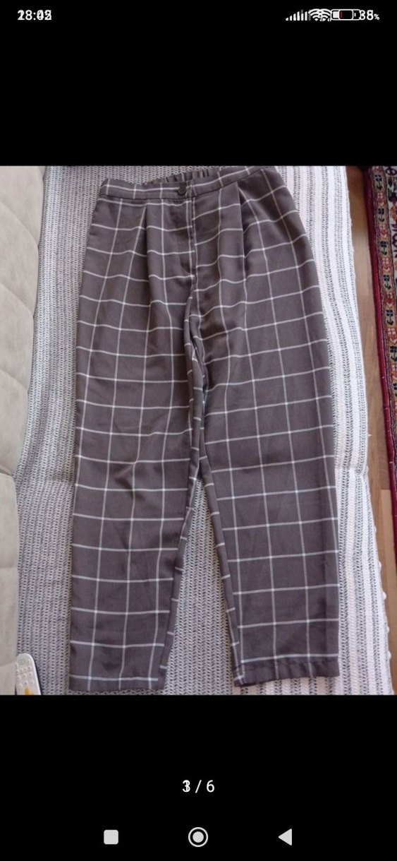Gri, pilili, salaş kesim kumaş pantolon. Kareli deseniyle midi boyda, günlük sokak stili için uygun.