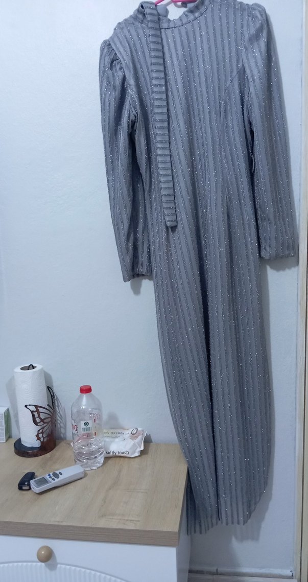 Gri, uzun kollu elbise, kesik yakalı ve pilili tasarıma sahip, yumuşak sentetik kumaştan, regular fit. Ofis kullanımı için uygun. 42 44 bedene uygundur
