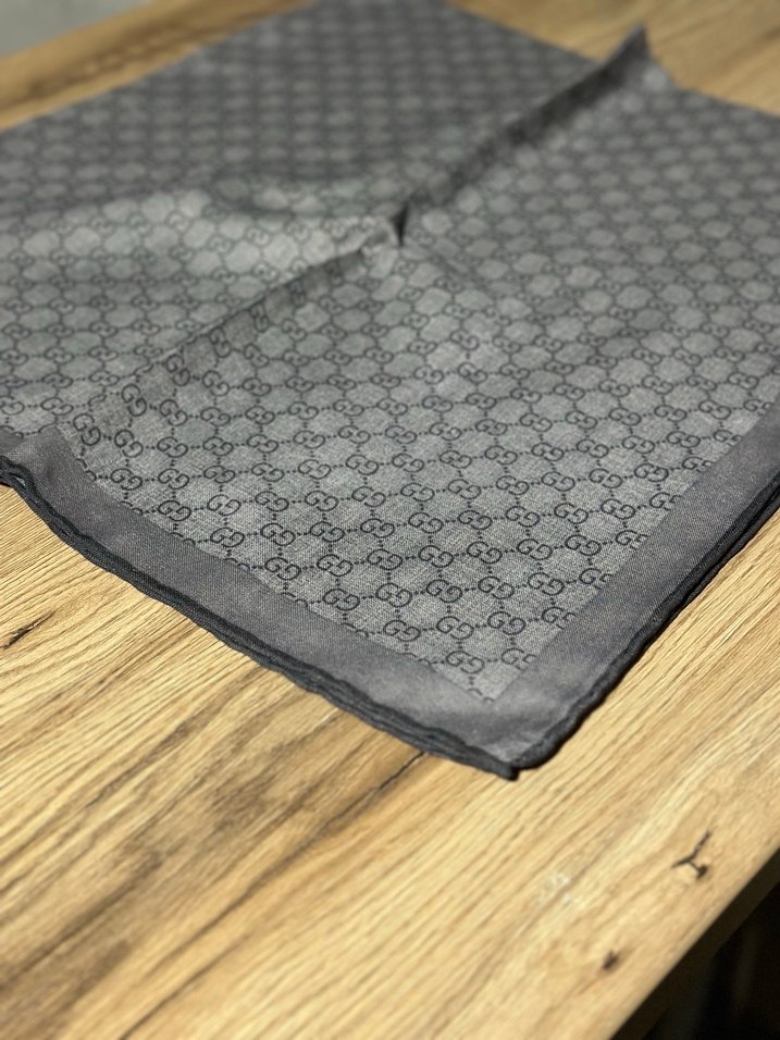 Yumuşak sentetik kumaştan yapılmış gri pilili kadın şalı, vintage desenli, mütevazı ve geleneksel tarzda.