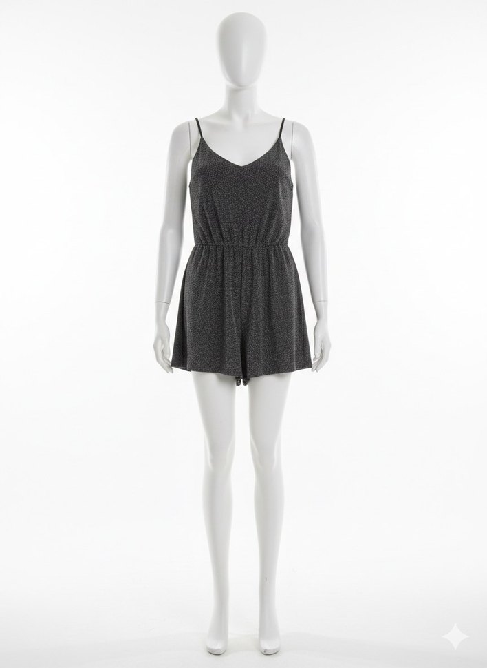Kadın gri puantiyeli mini tulum, ince askılı ve V yaka detaylıdır. Sentetik kumaştan üretilmiş, rahat kesimiyle minimalist ve çağdaş bir görünüme sahiptir. Romantik akşamlar için şık ve rahat bir tercihtir. ✨