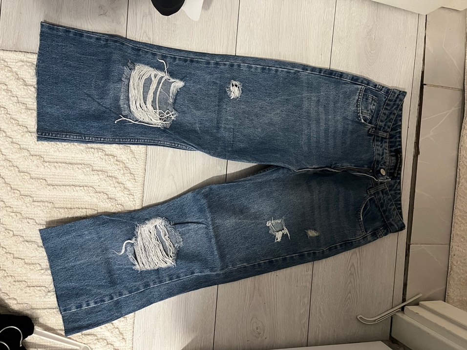 Bu mavi-gri kadın kot pantolonlar, bol kesim ve tokalı detaylarla günlük kullanım için yırtık tasarıma sahip sokak stili pantolonlardır.