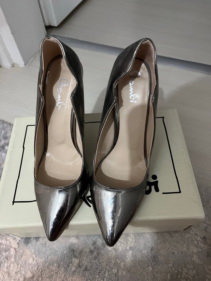 Kadınlar için parlak gri kauçuk malzemeden yapılmış, ince topuklu stiletto ayakkabılar. Ofis ortamına uygun, desen içermeyen çağdaş bir stile sahiptir.
