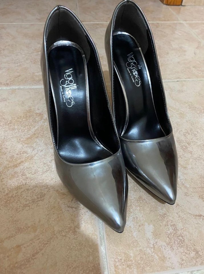 Rugan görünümlü gri stiletto topuklu ayakkabı, kauçuk malzemeden yapılmış, modern klasik tarzda ve ofis kullanımı için uygundur. Desensiz ve sivri burunlu. Sadece 1 kez giyildi