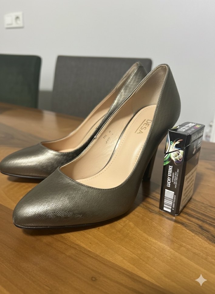 Gri rugan yılan desenli, topuklu kadın stiletto. Ofis için uygun, çağdaş ve klasik şıklık sunar.