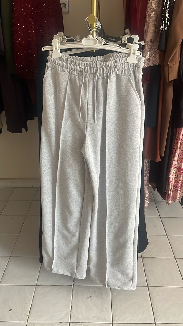 Kadınlar için gri renkte, elastik bel bantlı, salaş kesim midi uzunlukta eşofman altı. Yumuşak sentetik kumaştan, günlük rahat ve şık stil için uygundur.