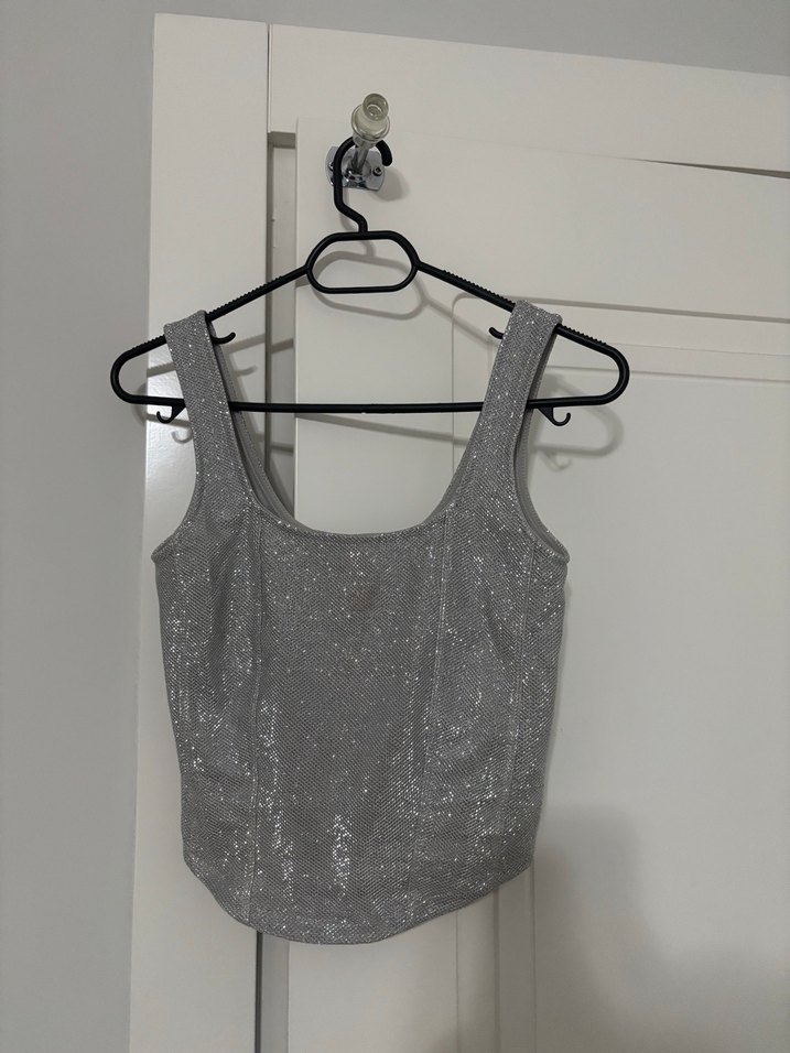 Kolsuz, V yaka, payetli ve vücuda oturan korse model gri crop top. Parlak dokusu ile parti için uygun, sentetik kumaştan üretilmiştir. ✨
