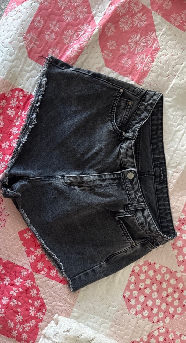 Kadınlar için gri siyah tie-dye desenli, bağcıklı detaylı, bol kesim mini kot şort. Kısa boylu ve püsküllü kenarlara sahip, günlük sokak stili için uygun.