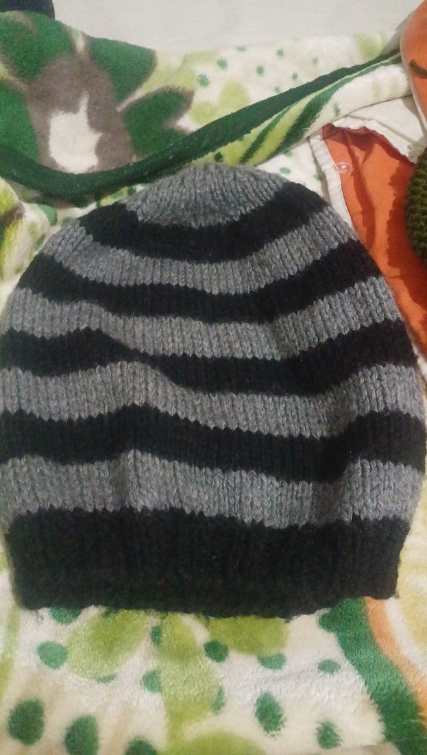 Gri ve siyah çizgili, yumuşak örgü kumaştan yapılmış kadın bere, rahat ve sade bir stil sunar.