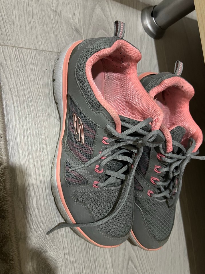 Gri renkli, bağcıklı, düz tabanlı ve pembe astarlı kadın spor ayakkabısı, spor ve günlük sokak stili için uygun. ♀️