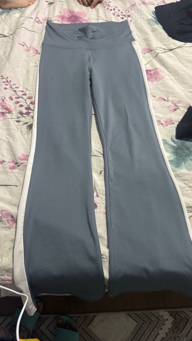 Kadınlara özel gri, elastik bel bantlı, beyaz yan şeritli spor kumaş pantolon. Midi boy, rahat sentetik kumaş ve dar kesim. ♀️