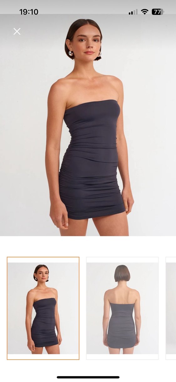Fitted, straplez, gri renkli ve ipeksi dokulu bu mini elbise minimalist ve çağdaş tasarıma sahip. Kolsuz ve romantik akşamlar için rahat şıklık sunar.