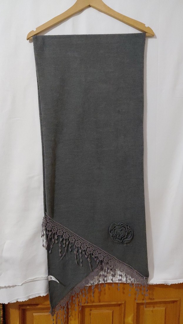 Gri süet kumaştan, drapeli kadın şalı. Bohem tarzda, püskül ve çiçek detaylı, rahat ve retro görünümlü. uzunkuk 192cm genişlik 46cm
