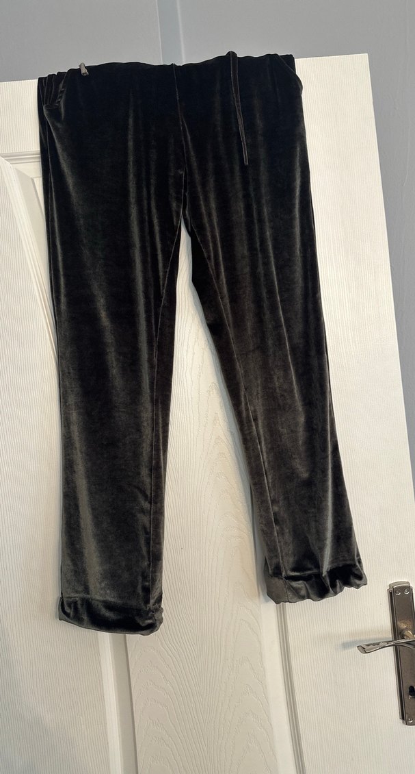 Yumuşak süet kumaştan, bol kesim, kuşaklı ve normal midi boyda kadın gri pantolon. Desensiz ve rahat tarzıyla romantik geceye uygun.