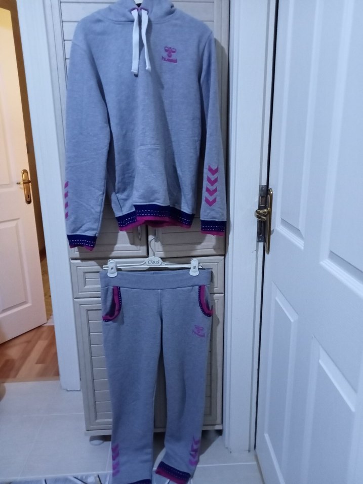 Gri, uzun kollu, bisiklet yaka sweatshirt ve eşofman altı takımı. Yumuşak ve sıcak kumaştan, fermuarlı ceplerle, mor detaylı rahat kesim.