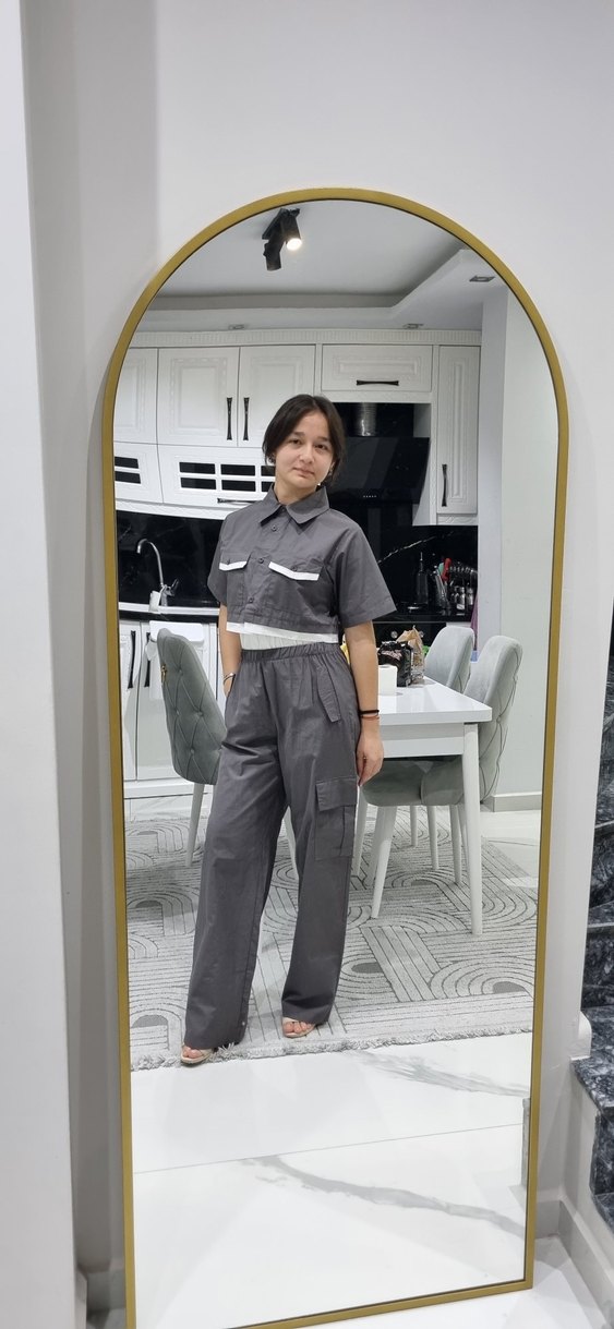 Pamuklu kumaştan yapılmış, yakalı ve kısa kollu gri takım. Kemeri beyaz lastik detaylı, baskılı desenli, midi boyda ve regular fit. EYYO markadir✨️ kalite