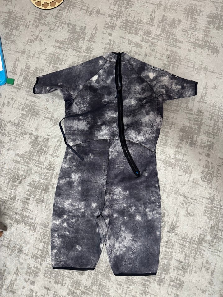gri tie-dye desenli, yüksek yakalı, kısa kollu dalgıç sörf kiyafeti sayili giyildi sifir ayarinda kusuru yok