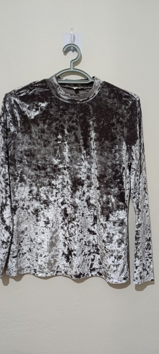 Yumuşak sentetik kumaştan, gri tie-dye desenli, yüksek yakalı ve uzun kollu, vücuda oturan kadın bluz. Parti ve günlük şıklık için uygun.