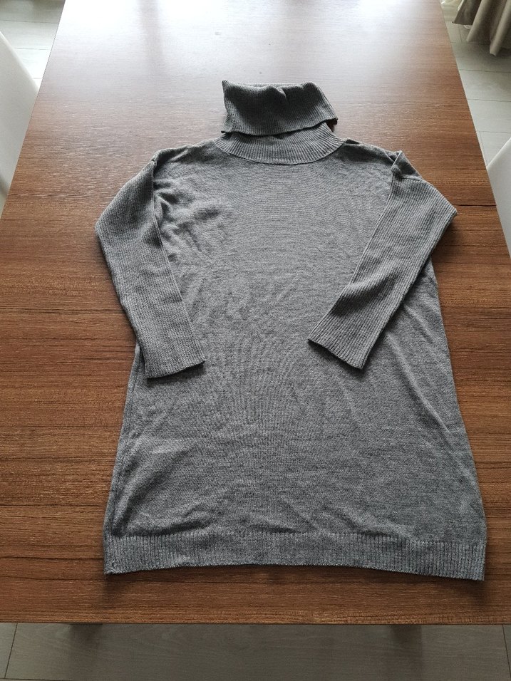 Gri renkli, triko örme, bol kesim, balıkçı yaka ve uzun kollu kazak. Midi boyda, yumuşak kumaştan, günlük rahat kullanıma uygun.