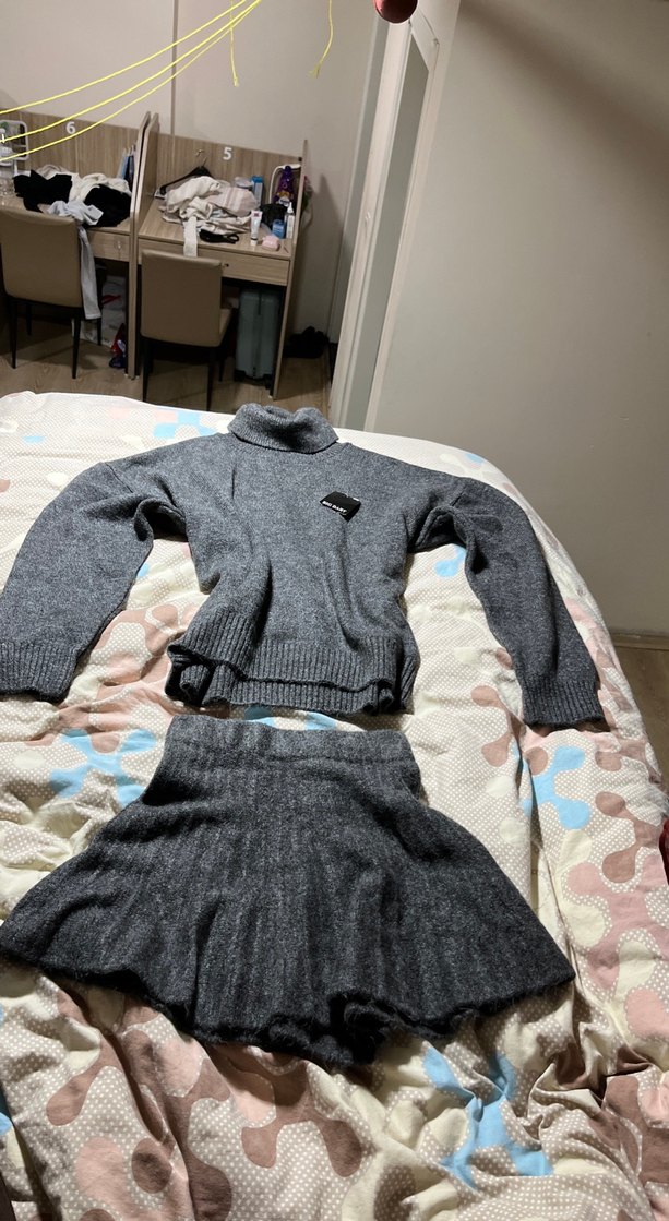 Gri renkli, uzun kollu, boğazlı, bol kesim örme kazak ve uyumlu mini etek takımı Rahat ve şık günlük kombin için ideal. esnek bir kalıbı var standart beden yazıyor. hediye olarak gelmişti hiç kullanmadım etiketi üzerinde duruyor