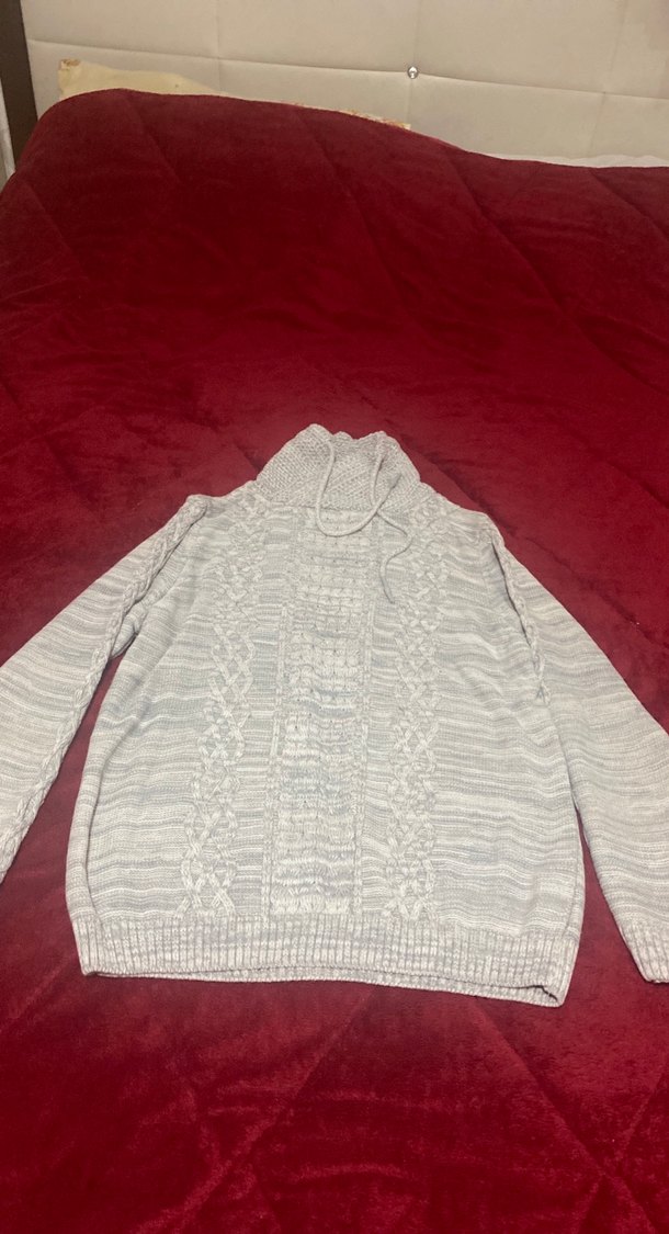 Kadınlar için yüksek yakalı, uzun kollu, yumuşak triko kumaştan yapılmış gri kazak. Rahat kesimi ve normal boyu ile günlük sokak stiline uygun.