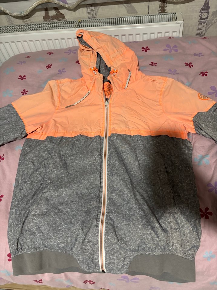 Kadınlar için, uzun kollu ve yüksek yakalı, fermuarlı, gri ve turuncu renklerde rahat kesimli bir ceket. Yumuşak ve sıcak kumaştan üretilmiştir, günlük kullanım için uygundur.