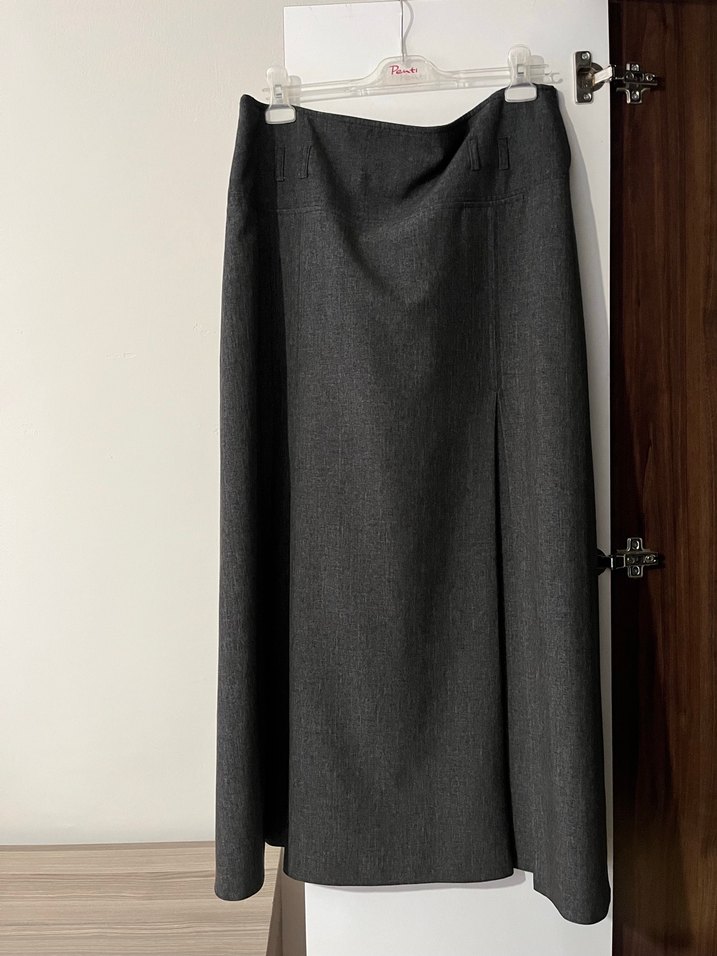 Kadınlar için gri renkte, uzun boyda, drapeli ve düz kesim sentetik kumaştan yapılmış etek. İş ortamına uygun sade ve normcore tarzda.