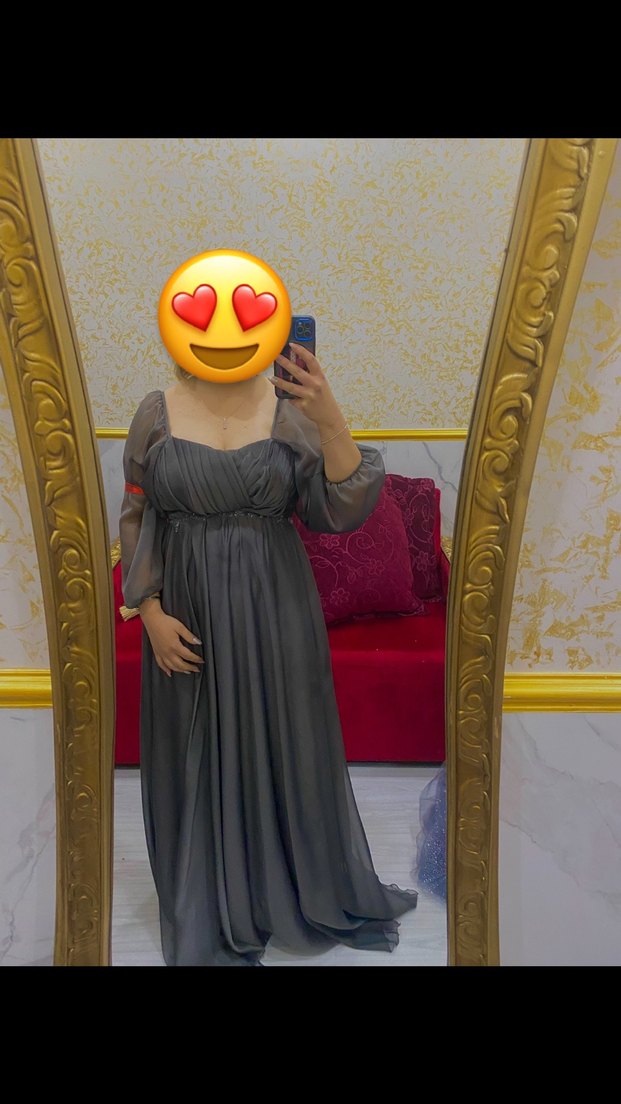 Gri renkli uzun elbise, drapeli tasarım, V yaka , sırt detaylı ve uzun kolludur. Bol kesim ve baskılı deseniyle cesur gotik düğünlere uygundur. Özel dikim