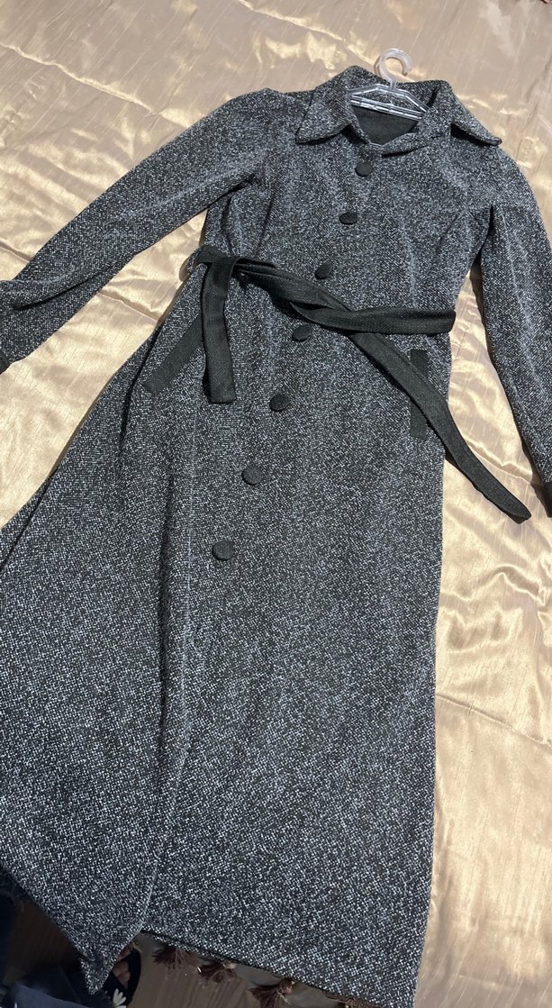 Bu kadın gri kaban, uzun boyu, düğmeli ve kemerli tasarımıyla dikkat çeker. Notlu yaka ve uzun kolludur, yumuşak sentetik kumaştan yapılmıştır. Günlük kullanım için uygundur.